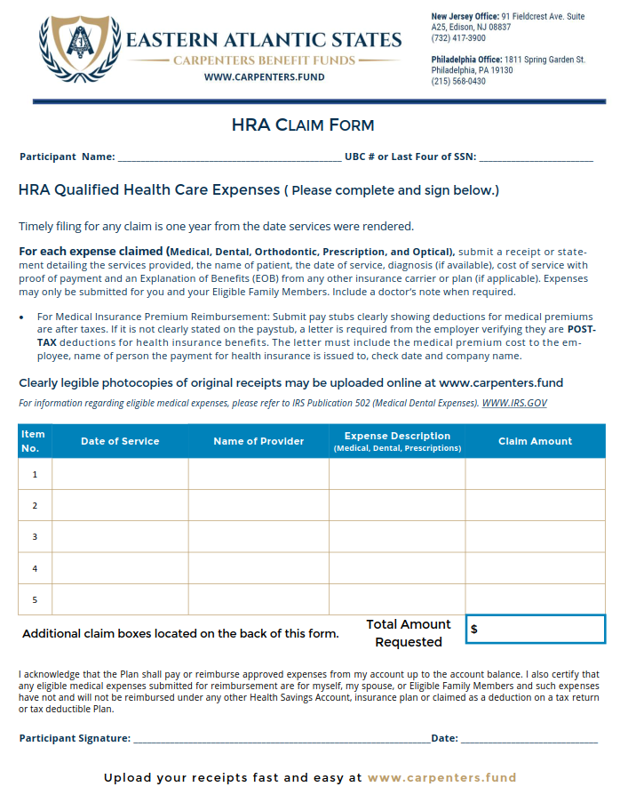Filename HRA-CLAIM-FORM_EAS.pdf Filesize 541.88 KB Version 3.0 Date added April 28, 2025 Category Health & Welfare